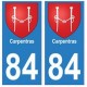 Etiqueta engomada de la placa de matriculación escudo de armas del departamento de Vaucluse 84 de la ciudad de Carpentras