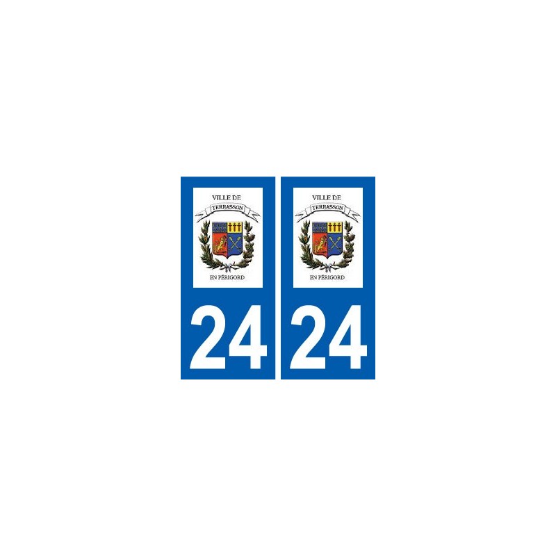 Autocollants Stickers aux dimensions des plaques d'immatriculation du département 24 Terrasson-Lavilledieu logo ville conforme aux dimensions des plaques d'immatriculations d'origines pour voiture auto.